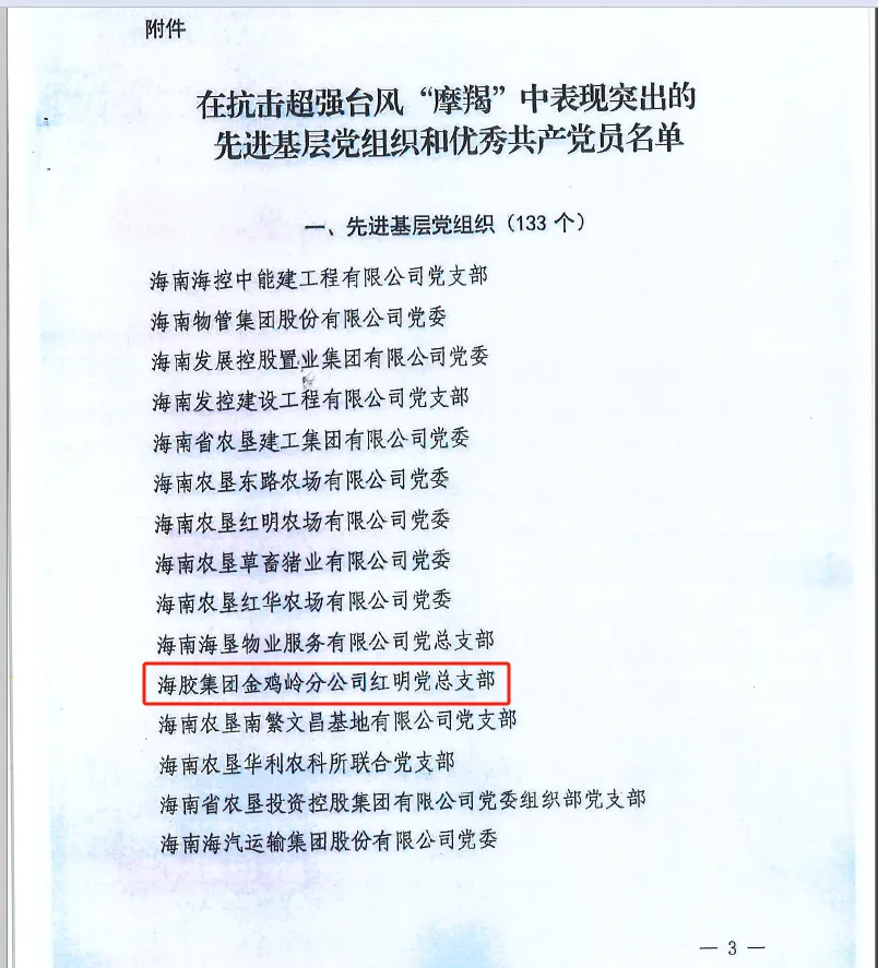 海南橡膠多個基層黨組織和黨員榮獲海墾集團(tuán)抗擊超強(qiáng)臺風(fēng)“摩羯”中表現(xiàn)突出的先進(jìn)基層黨組織和優(yōu)秀共產(chǎn)黨員榮譽(yù)稱號